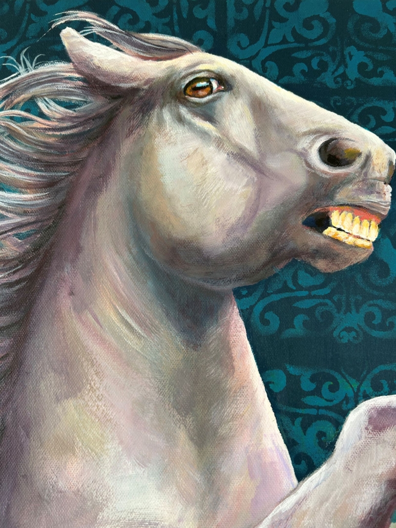 Acrylic painting on stretched canvas. The colour white without being too white. The Grey is winding itself near the fragile porcelain. Held, but not bound on a copper metal chain. The copper changes its cast when observed from different angles. The white paper protests. Public force – growing power under oppression.